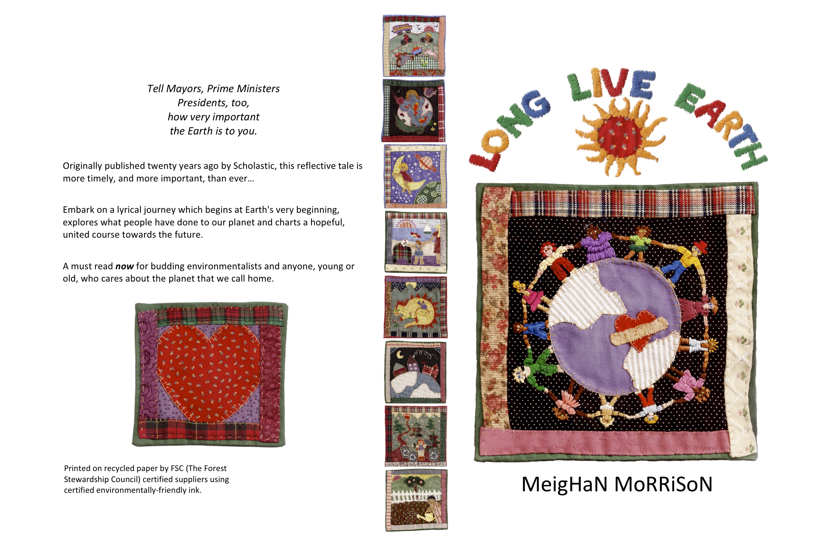 If you are looking for a charming, colorful and creative book to teach children about taking care of our earth, this book delights. The illustrations embody the philosophy: they are quilt squares, making use of unused fabric. Each illustration is imaginatively conceived and stitched. Children will have fun talking about what they see in the squares. The illustrations are quite winsome…(read entire review here).